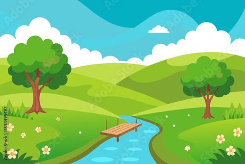 © vector db, Fototapeta premium Vector summer landscape with green trees, grass, and mountains under a clear sky