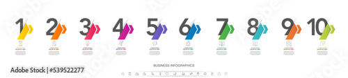 Fototapeta premium Vector timeline infographics with 10 steps, icons, flowchart, workflow and process infographic. Illustration template with arrows.