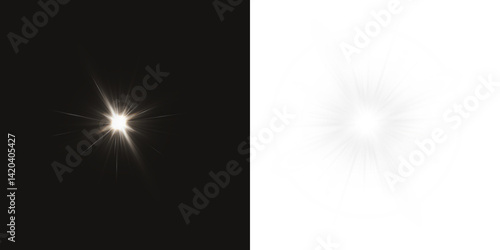 © Ada_vector_stok, Naklejka premium Vector transparent sunlight with sun glare. Overlay, Sun rays and glare, Sun, sunrays, light transitions, lens flare, light leaks and glare in PNG format. PNG sunlight flare. Golden flash and glare.
