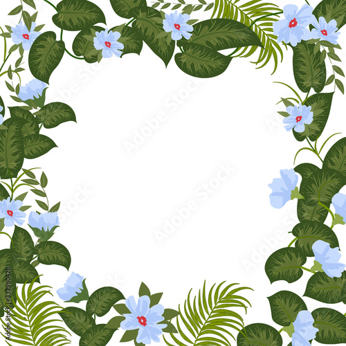 © Artlu, Fototapeta premium Vector tropical jungle banner, frame with palm trees leaves and blue flowers
