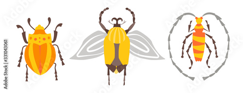 Fototapeta premium Vector Tropical set of exotic insects in flat hand-drawn style. Beetles and cockroaches, insects with wings and mustache. Yellow and orange insects and colorful flat graphics. Stickers, website design
