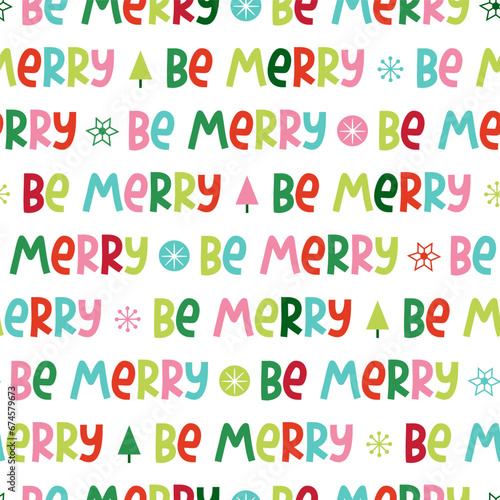 Fototapeta premium Vector typography Christmas seamless pattern. Colorful Be Merry text repeat background for winter holiday, print, wallpaper with lettering, textile, fabric, wrap paper, package design.