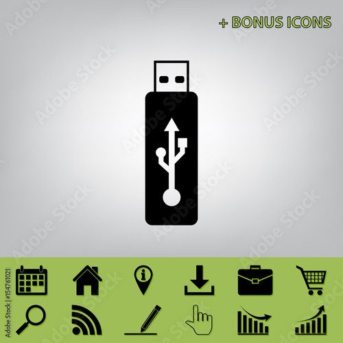 © asmati, Obraz premium Vector USB flash drive sign. Vector. Black icon at gray background with bonus icons at celery ones