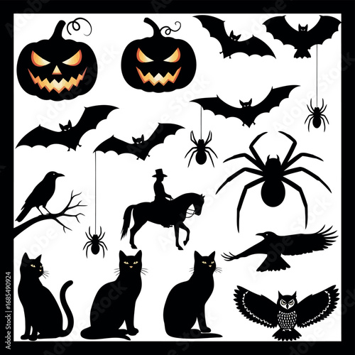 © SampaRani, Fototapeta premium Vector vector art of collection of halloween symbols including pumpkins, bats, spiders, cats, owl, raven, and a horse rider transparent background