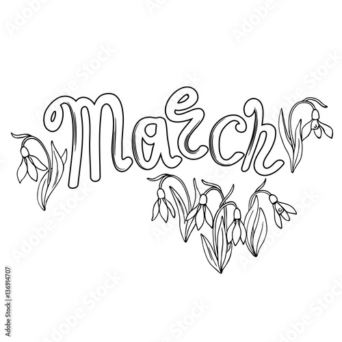 Fototapeta premium vector white black contour sketch of snowdrop flowers with word march