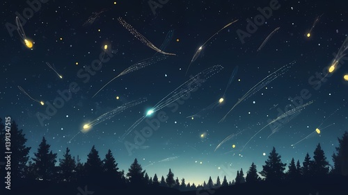 Naklejka premium Vectorized fireflies leaving particle trails in the night sky, dreamy aesthetic