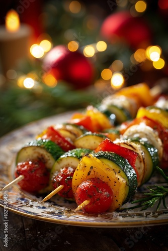 © MNStudio, Naklejka premium Vegetable skewers with star-cut peppers and zucchini slices rest on a festive plate under blurred holiday lights. Their bright colors add freshness to the Christmas table.