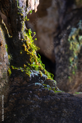 © Xalanx, Obraz premium Vegetation growing on speleothem inside cave