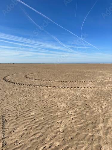 © ReayWorld, Naklejka premium Vehicle tracks on the beach with a blue sky background. Low angle view.