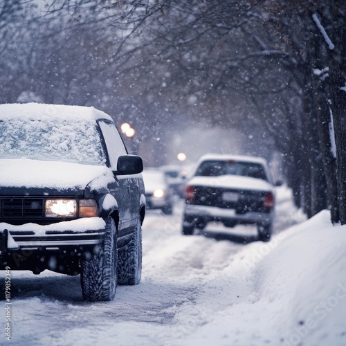 Naklejka premium Vehicles and tires navigating snowy roads in serene winter conditions, HD...
