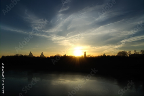 © syntheticmessiah, Fototapeta premium Veliky Novgorod Russia. Silhouette architectural landscape - towers of Veliky Novgorod Kremlin, Russia, at the sunset under the rays of sunlight