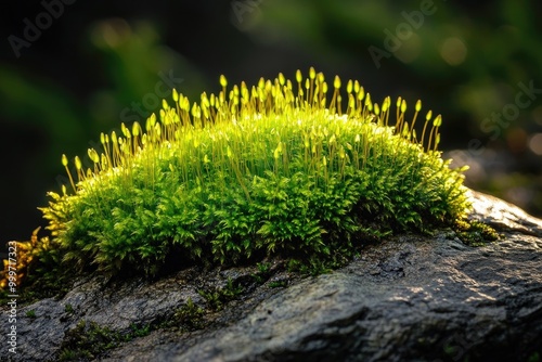 Naklejka premium Velvet moss texture growing on a damp rock under soft, filtered light