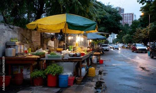 © simba kim, Obraz premium vendors in the process of setting up their food stall in chinatown kl during early evening