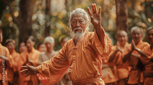 Fototapeta premium Venerable Grand Master of Tai Chi Chuan demonstrates Exercises Wallpaper Background Magazine Brainstorming Poster Martial-Arts Digital Art Cover