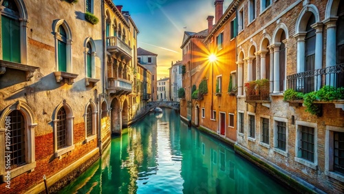 © Sirinporn, Fototapeta premium Venice Canal, Italy: Serene Gondola-Free Waterway with Copy Space for Text
