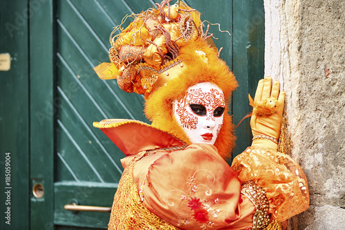 Fototapeta premium Venice carnival: 2017. Carnival mask. Venice, Itali. Orange carnival costume in Venice