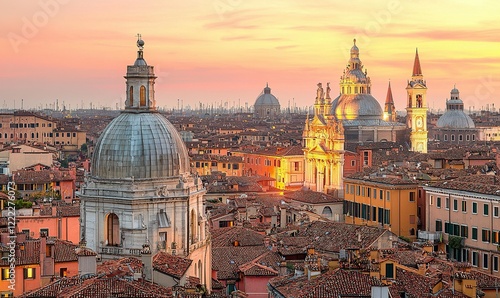 © SubawaYasa, Naklejka premium Venice skyline at sunset with church domes, rooftops, and warm glow