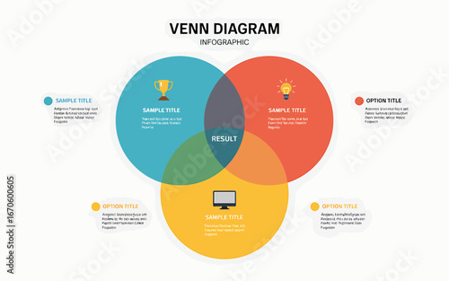 © NUSRAT, Fototapeta premium Venn Diagram Infographic Template Demonstrating Overlapping Sets and Logical Relationships for Presentations and Data Analysis with Trophy Idea and Computer Icon