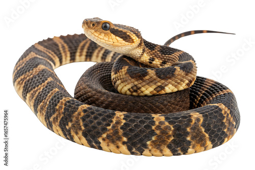 © Poorna Himasha, Obraz premium Venomous Cottonmouth Snake Coiled and Looking Alert with Patterned Scales Isolated on White Background