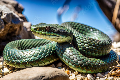 Fototapeta premium Venomous Viper. Reptile Snake Photo for 2025 Year symbol. Blurred jungle...