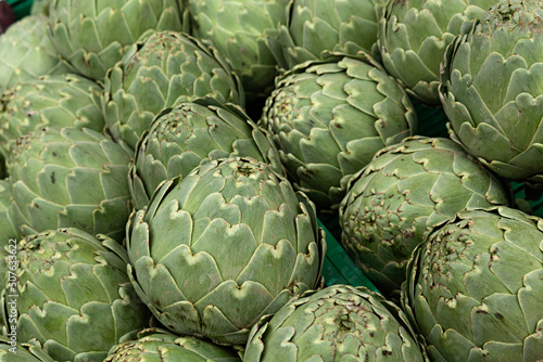 © Lola Fdez. Nogales, Fototapeta premium Venta de alcachofas en puesto del mercado.