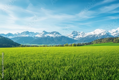 © arri, Fototapeta premium Verdant Field Against Majestic Snowcapped Mountains
