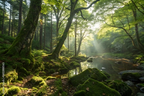 © Graph Art, Fototapeta premium Verdant forest stream bathed in ethereal sunbeams moss trees