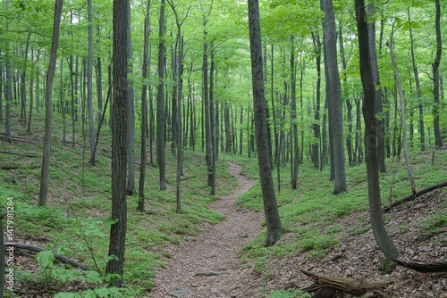 Fototapeta premium Verdant forest trail winds through lush woodland.