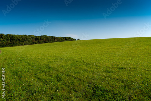 Obraz premium Verdant grassland with a forest and a clear blue sky near St Issey in north...