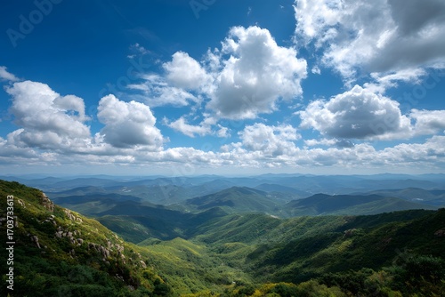 © Mahmudul, Fototapeta premium Verdant mountain range under blue sky mountains green