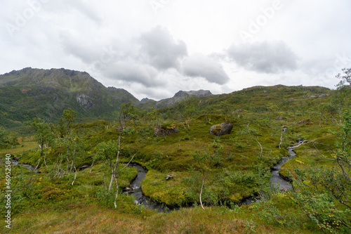 Fototapeta premium Verdant mountains and rocky terrain in the Lofoten Islands, Norway.