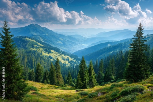 © De, Fototapeta premium Verdant mountains with distant peaks under a blue sky dotted with fluffy clouds