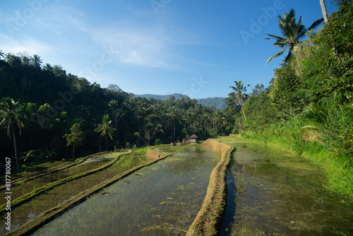 © Marcel, Fototapeta premium Verdant rice terraces in a tropical valley with palm trees