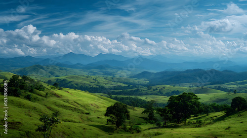 Naklejka premium Verdant rolling hills under a vast blue sky with scattered clouds landscape mountains
