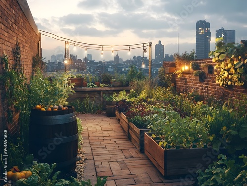 © Siriroj, Fototapeta premium Verdant Rooftop Oasis Thriving Urban Garden with Cityscape Backdrop