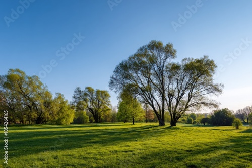Fototapeta premium Verdant spring landscape with tall trees and clear blue sky