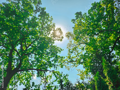 © katrin888, Fototapeta premium Verdant tree branches frame a clear blue sky, with sunlight filtering through leaves.