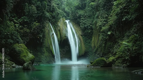 © Berkah1789, Fototapeta premium Verdant waterfall flows into a tranquil turquoise pool of water