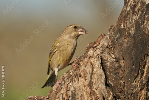 Fototapeta premium verderón europeo o verderón común​ (Chloris chloris)​ posado en un tronco