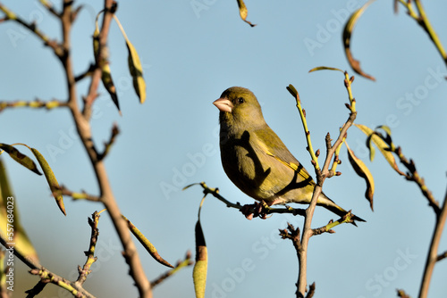 Naklejka premium verderón europeo o verderón común posado en una rama con fondo azul (Chloris chloris)​ Málaga Andalucía España