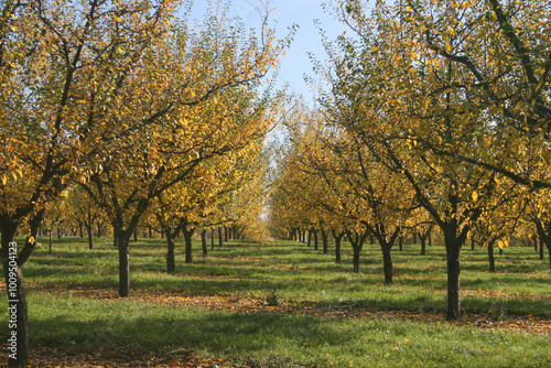 © jef 77, Naklejka premium verger avec mirabelliers aux couleurs d'automne