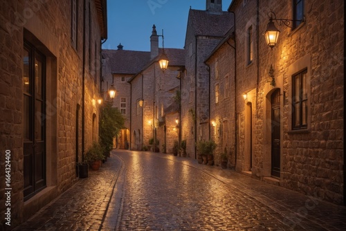 © Michael, Fototapeta premium Verlassene Gasse mit historischen Steinwänden und Laternen bei Dämmerung