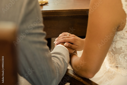 © hemminetti, Obraz premium verliebtes Brautpaar während der standesamtlichen Trauung hält Händchn