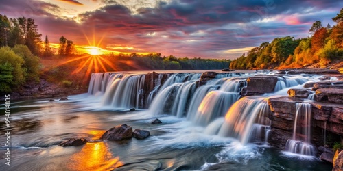 © Arethaawykoff, Obraz premium Vermillion Falls in the evening, the sun's final rays dance across the cascading water, creating a kaleidoscope of colors, dark rocks in the foreground.