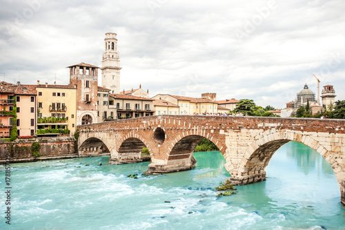 Naklejka premium Verona. Bridge Ponte Pietra in Verona on Adige river.
