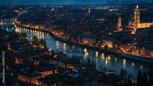 © The Little Hut, Fototapeta premium Verona Italy high angle view night city skyline at Adige river and Verona Cathedral : Generative AI
