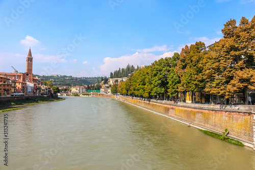 Obraz premium Verona, Italy. View of Adige river embankment in sunny day.