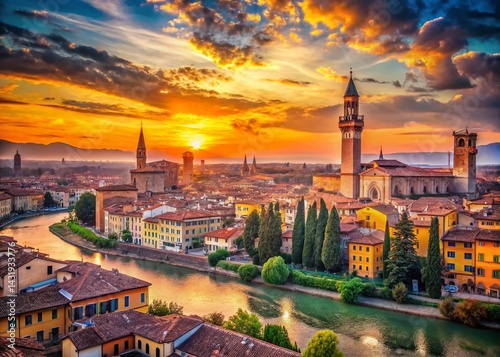 © Adisorn, Naklejka premium Verona Skyline Pop Art: Vibrant Cityscape at Sunset