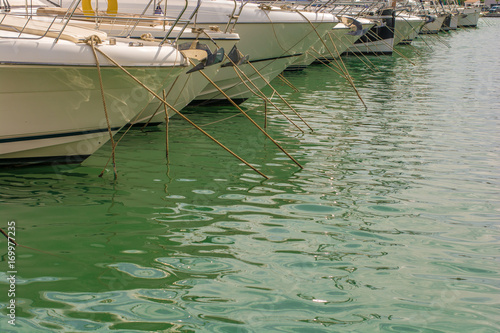 Fototapeta premium Verschiedene Boote liegen im Hafen vor Anker