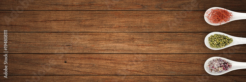 Fototapeta premium Verschiedene Gewürze mit Löffel auf Küchenplatte - Banner | Hintergrund